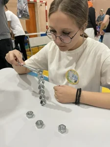 Но и это ещё не всё! В конкурсе «Высокое искусство» нашим ребятам предстояло создать устойчивую конструкцию башни из гаек, чтобы она выдержала любые проверки 😱🏗️