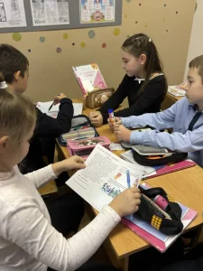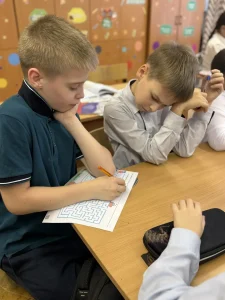 Практическая часть занятия была особенно интересной — ребята работали в группах над специальным рабочим листом, где закрепили полученные знания на практике. Каждая группа представила свои идеи и решения, поделившись ими с классом.