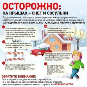 В зимнее время на крышах зданий скапливается большое количество снега и наледи, а также образуются сосульки, которые достигают значительных размеров. Во время оттепели происходит сход снега с крыш зданий и падение сосулек. Находясь в опасной зоне, можно получить от падающего снега и сосулек тяжелые и опасные травмы и даже погибнуть. Чтобы не оказаться в подобной ситуации, следует:
